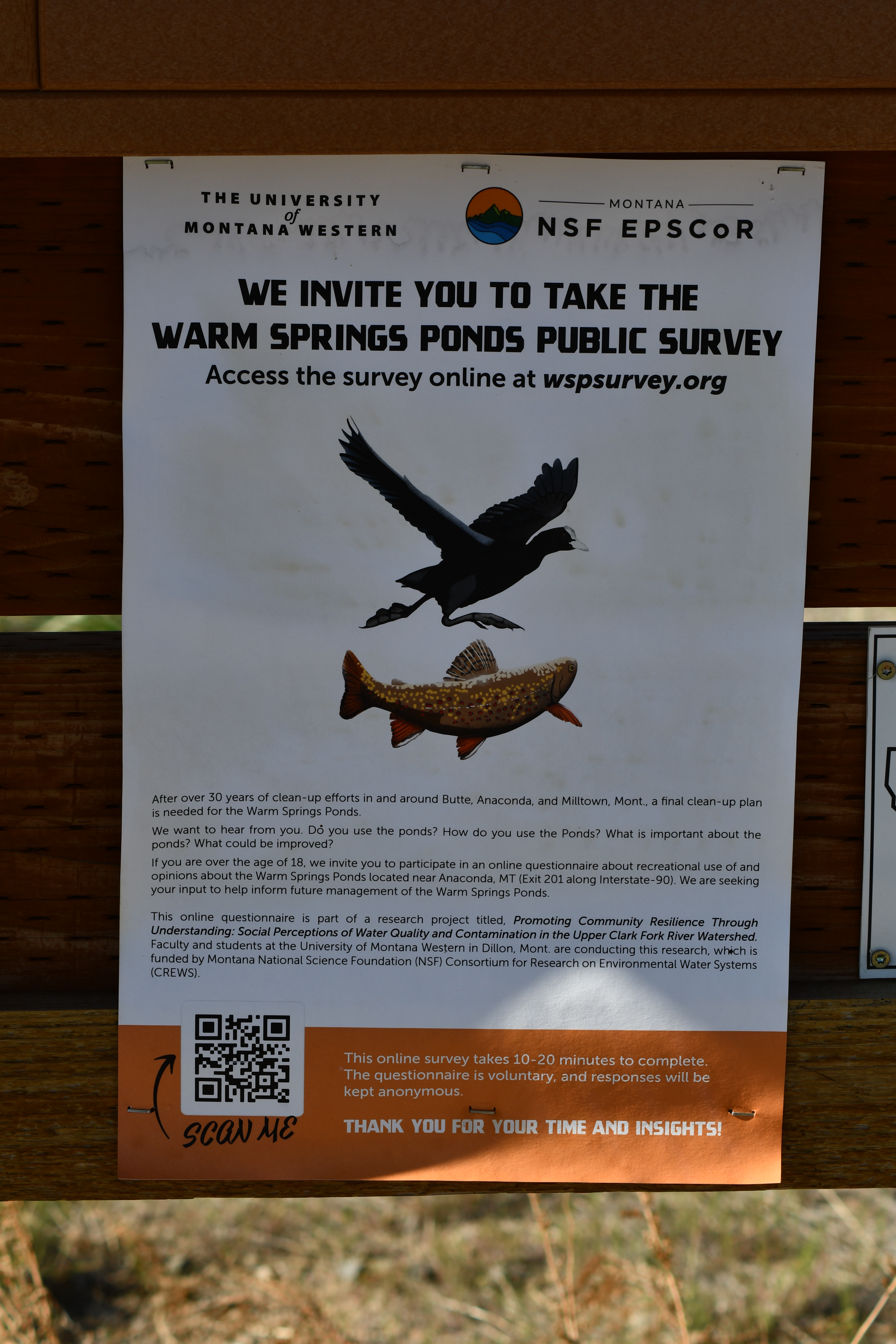 By training UM Western students in social science research design and application, students worked to document recreational use and public perceptions of water quality and contamination of the Warm Springs Ponds. Students learned first-hand both the challenges and rewards of collecting observation, survey, interview, and public records data as well as practicing how to relay knowledge to decision-makers that is both accessible and usable. This project was completed in close collaboration with ARCO, U.S. EPA, Montana Fish, Wildlife & Parks, Montana Natural Resource Damage Program (NRDP), and the Clark Fork Coalition to help inform future management decisions about the Warm Springs Ponds.